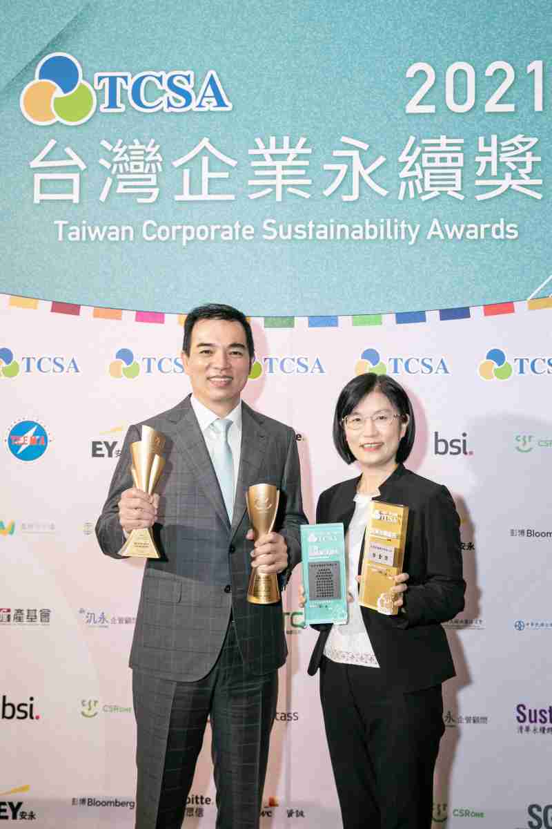 达在台湾永续奖所评比环境、、社会、、、、治理等各面向的永续绩效均获高度肯定 (左:JDB电子光电总经理暨营运长柯富仁,,右:JDB电子光电永续长古秀华)