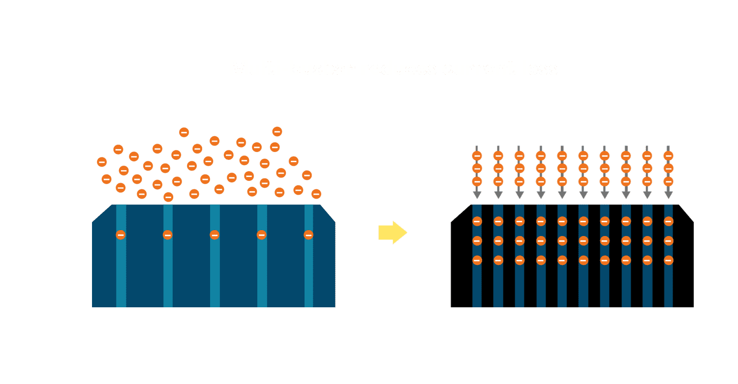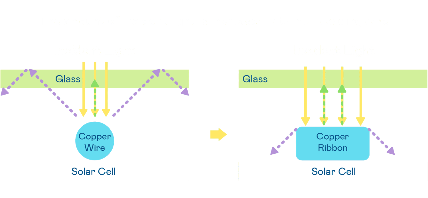- 电池使用多条铜导线 (Copper wire) 于电池片上形成较短的电流路径,,提高电流收集效率,,,采用圆形设计的铜导线较传统扁平式的铜焊带 (Ribbon),,,可增加入射至电池的光线量。。。