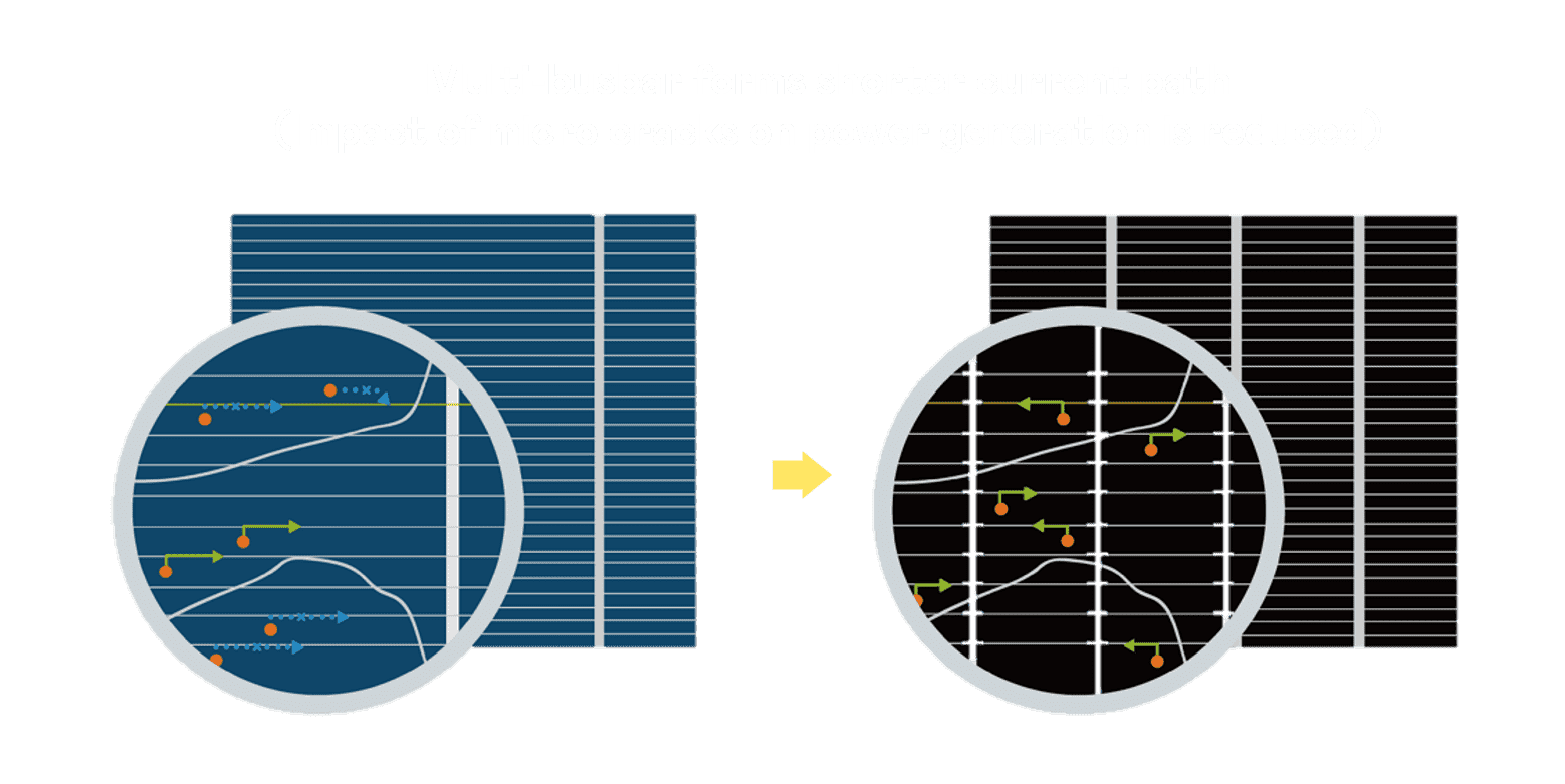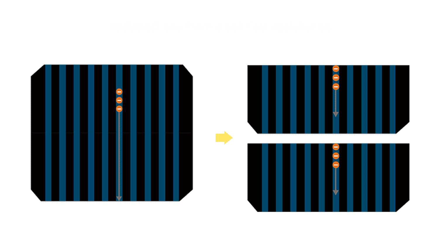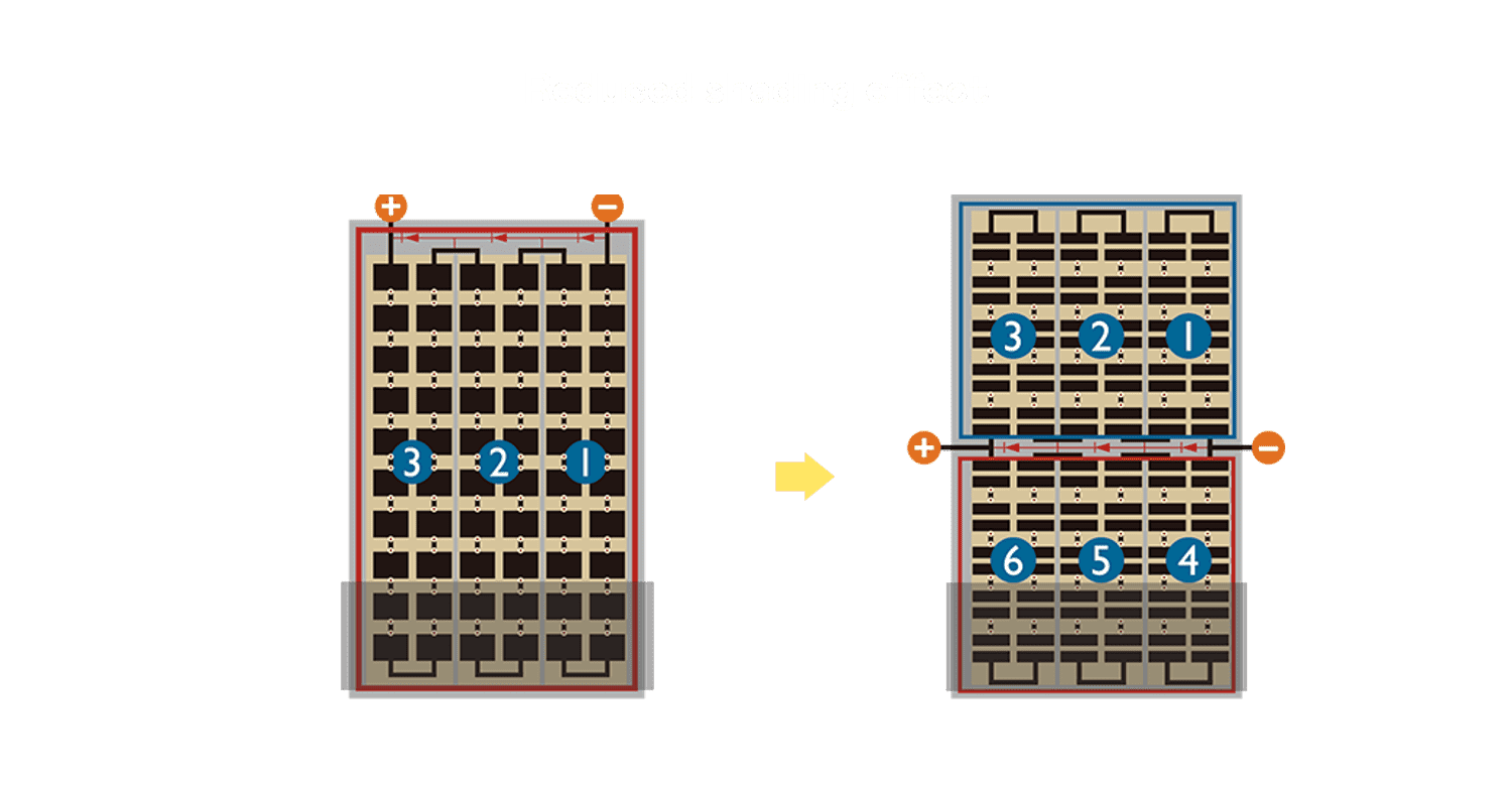 - 结合半切电池,,,降低遮阴影响、、、、提升模组抗隐裂能力、、并减少电阻损耗,,进一步提升模组发电效能。。